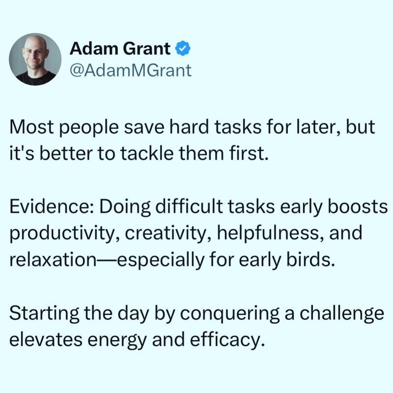 “Most people save hard tasks for later, but it's better to tackle them first.”